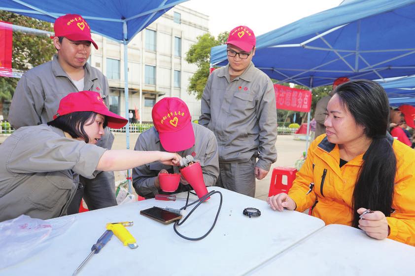 “小伙子,這個(gè)電烤箱壞了,你看能修好嗎?”“沒(méi)問(wèn)題,我?guī)湍愣ā!薄斑@些相片可以幫我過(guò)塑嗎?”“可以,馬上就給您過(guò)塑”……上午9時(shí)許,活動(dòng)剛剛開(kāi)始,廣場(chǎng)上就聚集了許多群眾,面對(duì)群眾的每一個(gè)困難或疑問(wèn),志愿者都熱情解答,并一一動(dòng)手解決。